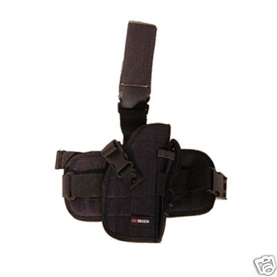 All items we sell are brand new, never used or surplus COLOR: Black, Tactical Black BRAND: Various (FiDragon or TAIGEAR) STYLE: Tactical Drop-Leg Holster, Military / SWAT Style HAND: RIGHT HANDED Fits most medium & large pistols / hand guns (Berretta, Glock, Air-soft, Etc.) 9mm 45 cal Air-soft Fully padded holster area for great comfort Adjustable for height and width Has strap to secure to most tactical utility belts Law enforcement quality velcro, snap-on & buckle system Made from premium synthetic material Non-slip pad leg for all day comfort There is a convenient extra magazine pouch on the front edge of the holster with a velcro cover to hold it securely in place A must for use in CQM and in any Tactical Environment Made to Combat Specs and is ready for any mission