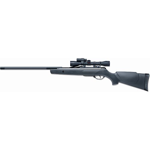 The GAMO® Varmint Hunter pellet rifle with a 4x32 scope is designed for hunting performance, offering 1200 fps of velocity with PBA pellets or 1000 fps with standard lead. It features a 4x32 air rifle scope that's matched with a laser sight and flashlight. The tough, all-weather stock has a ventilated rubber pad for recoil absorption and a thin cheekpad molded on each side.