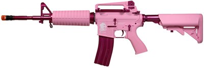 Ladies, take aim and fire with the G&G GR16 Femme Fatale AEG . This special edition assault rifle is completely metallic pink in color, and features the same fierce firepower that commands attention from competitors in the battlefield. The gun features a high torque long type motor, a high-capacity 450 Rd magazine, and a shot velocity of 360 fps (using .20g BBs). The battery of this gun is located in the foregrip, and an adjustable hop-up feature also allows greater velocity and accuracy with every shot fired. Do not miss this gun! Battery and Charger not included. Features: Semi / Fully Automatic Firing Adjustable Hop-up 6 Position Retractable Crane Stock Length: 31.5/35.5 Removable carrying handle Sling Adapters Velocity: 340-360 FPs with 0.2g BBs Body Material: Fiber Reinforced Plastic Gearbox: Version 2 (Metal) Made in Taiwan ... G&G FF16 Carbine, Pink Special Edition...
