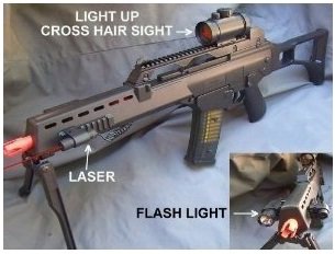 - # Gun comes with: Laser, Flashlight, Safety Glasses, and Red Dot Scope # Model 36 Elite Sniper Rifle Airsoft Gun # LED Crosshair in Telescopic Lens - Turn on the Sight, and a Red Lit Crosshair appears when you look through the sight - batteries included